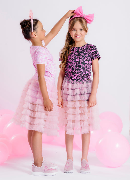Saia Babados Tule Short Light Estampa Barbie X Pituchinhus